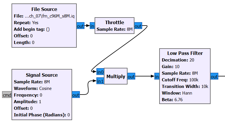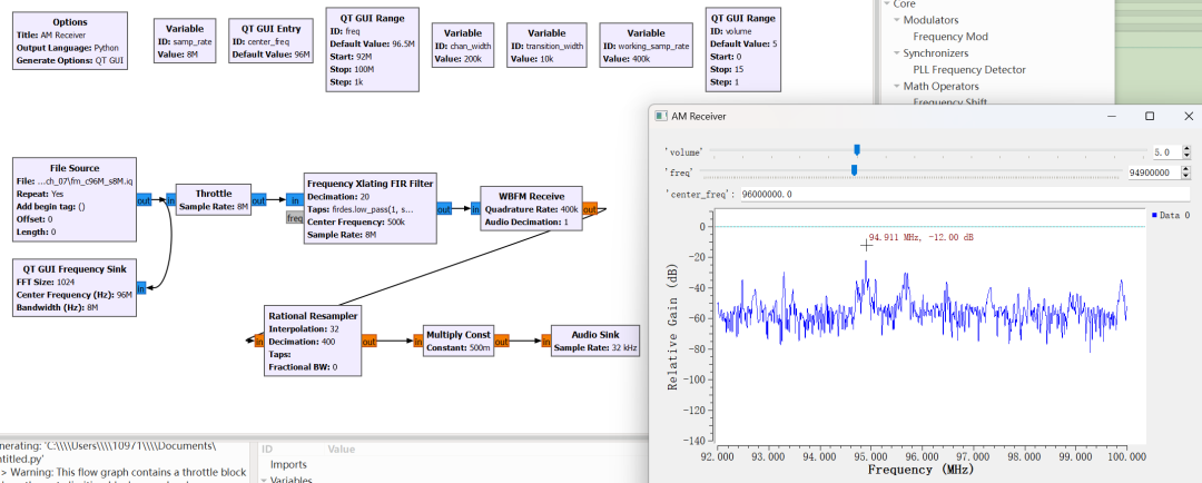 到此就完成了从 AM 到 FM 接收机的转变,但是还有一种更简洁的方法,目前我们调谐信号需要三个不同的模块(Signal Source、Multiply、Low Pass Filter)。实际上 GNU Radio 有一个集成了这些功能的模块(Frequency Xlating FIR Filter)它的功能就是:频移、滤波、抽取