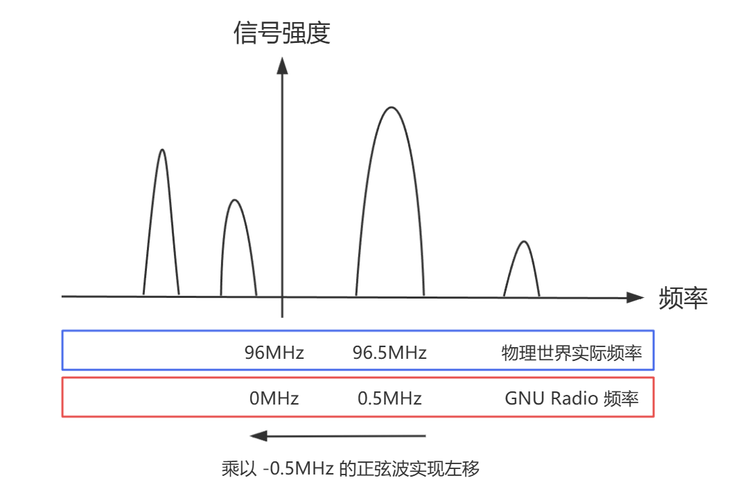 在 GNU Radio 中,信号以 0Hz 为中心,对应实际频率为 96MHz,假设我们想要调整到 96.5MHz,这个频率在 GNU Radio 中现在是 0.5MHz,那需要往左移动 0.5MHz,也就是乘以 -0.5MHz,这样实际中心频率就到了 96.5MHz