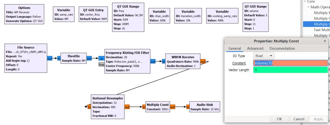 在 Rational Resampler 和 Audio Sink 之间添加一个 Multiply Const 模块,将 IO Type 设置为 float,并将 Constant 属性设置为 volume/10