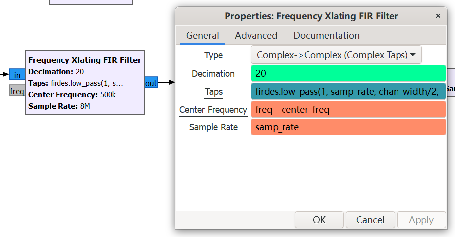 但在这个模块中,中心频率指的是将输入射频数据调整后的目标中心频率。例如,若要以 96.5MHz 为中心频率,这里应设置为 0.5MHz(即从 0MHz 调整到 0.5MHz),所以需要将中心频率设置为:freq - center_freq