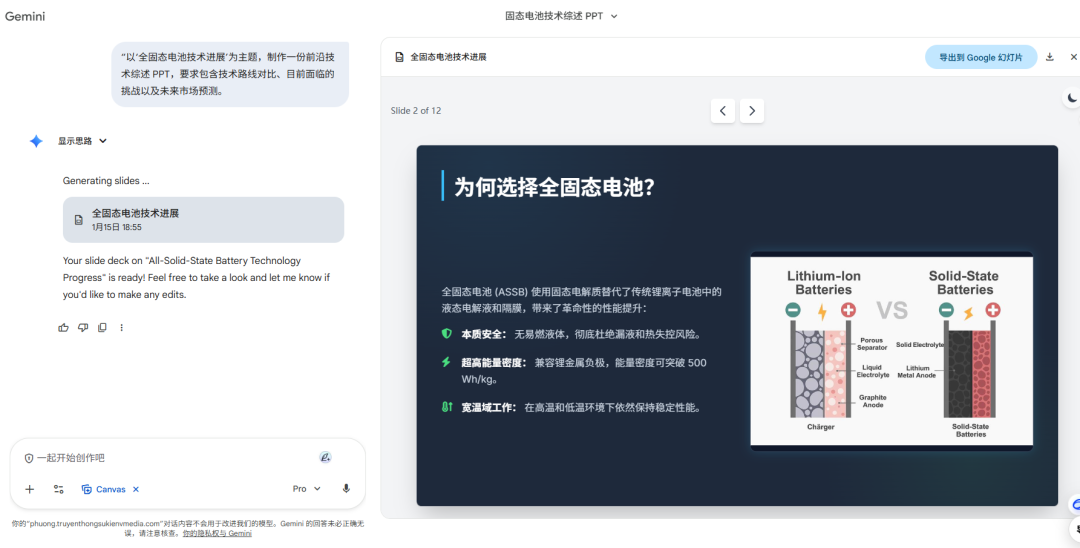传统的 AI 办 PPT 往往只是套个边框,内容经常乱码,且风格一股浓浓的AI味。但 Gemini 此次更新,配和 Canvas(画布)工具 ,表现惊人: