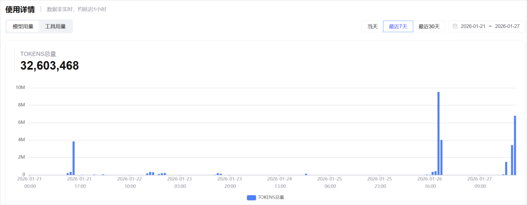 比如我们有个小伙伴,测试的时候,随随便便用GLM-4.7跑了两天,它直接跑掉了将近3000万Token。。。
