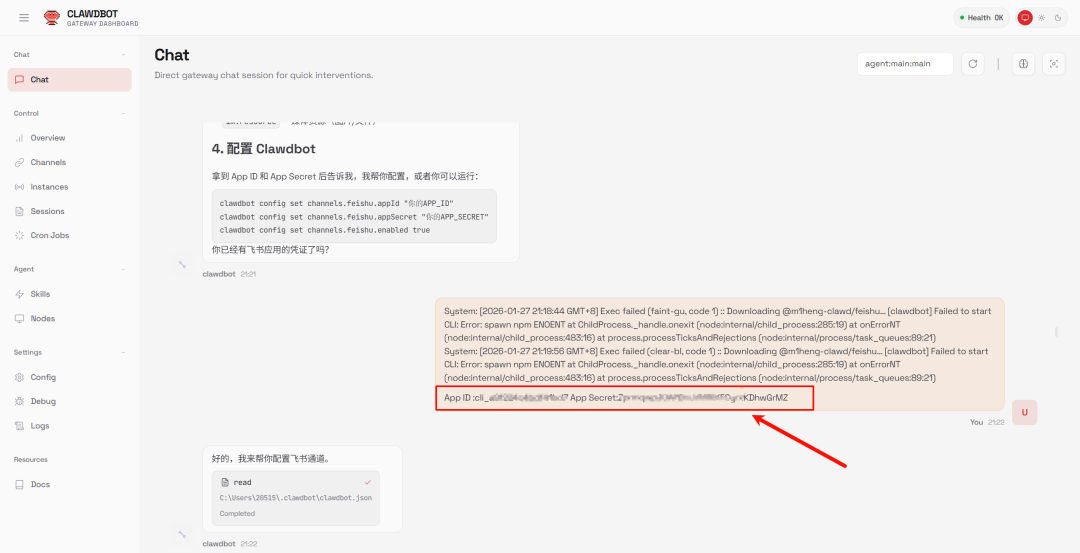 他说装好了之后,还需要去飞书开放平台(open.feishu.cn)建个应用,把App ID和App Secret记下来,接下来要用到,也是关键的一步。