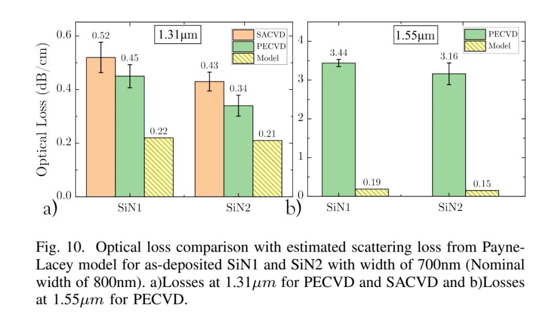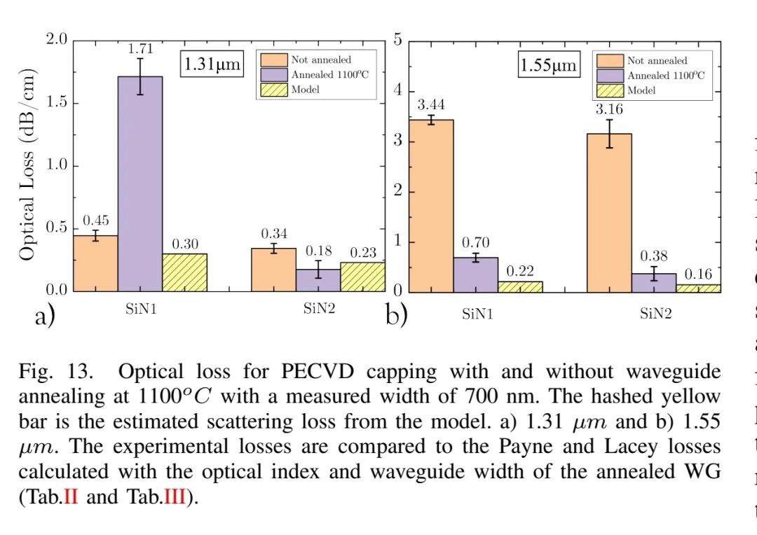 为此,CEA Leti研究团队通过系统实验与理论建模,深入探究PECVD SiN波导光传播损耗的关键控制参数,为有无热预算约束下的超低损耗平台构建提供指导。研究采用300 mm先进工艺设备制备波导,实现了退火前0.34 dB/cm@1310nm,退火后0.18 dB/cm@1310nm,0.35 dB/cm@1550nm的低损耗单模波导。结合Payne和Lacey散射模型,量化体材料损耗与表面散射损耗的贡献,重点分析了材料成分、侧壁粗糙度、退火处理及封装层特性对损耗的影响。