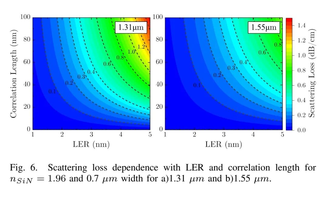模型仿真揭示了关键参数对散射损耗的影响规律:在1.31 μm波长下,散射损耗对粗糙度和相关长度更为敏感,要实现0.1-0.2 dB/cm的超低损耗,需同时控制LER≤2 nm且相关长度≤30 nm;芯层折射率每提升0.1,1.31 μm和1.55 μm波段损耗分别增加27%和34%;波导宽度每变化100 nm,损耗变化幅度仅为8%-10%,是影响最不敏感的参数。实验中采用的300 mm工艺虽实现了2.1 nm的低LER,但78 nm的相关长度成为进一步降低散射损耗的瓶颈——模型预测,若能将相关长度降至30 nm且保持低粗糙度,在消除体材料损耗的前提下,损耗可突破0.2 dB/cm甚至达到0.1 dB/cm以下。
