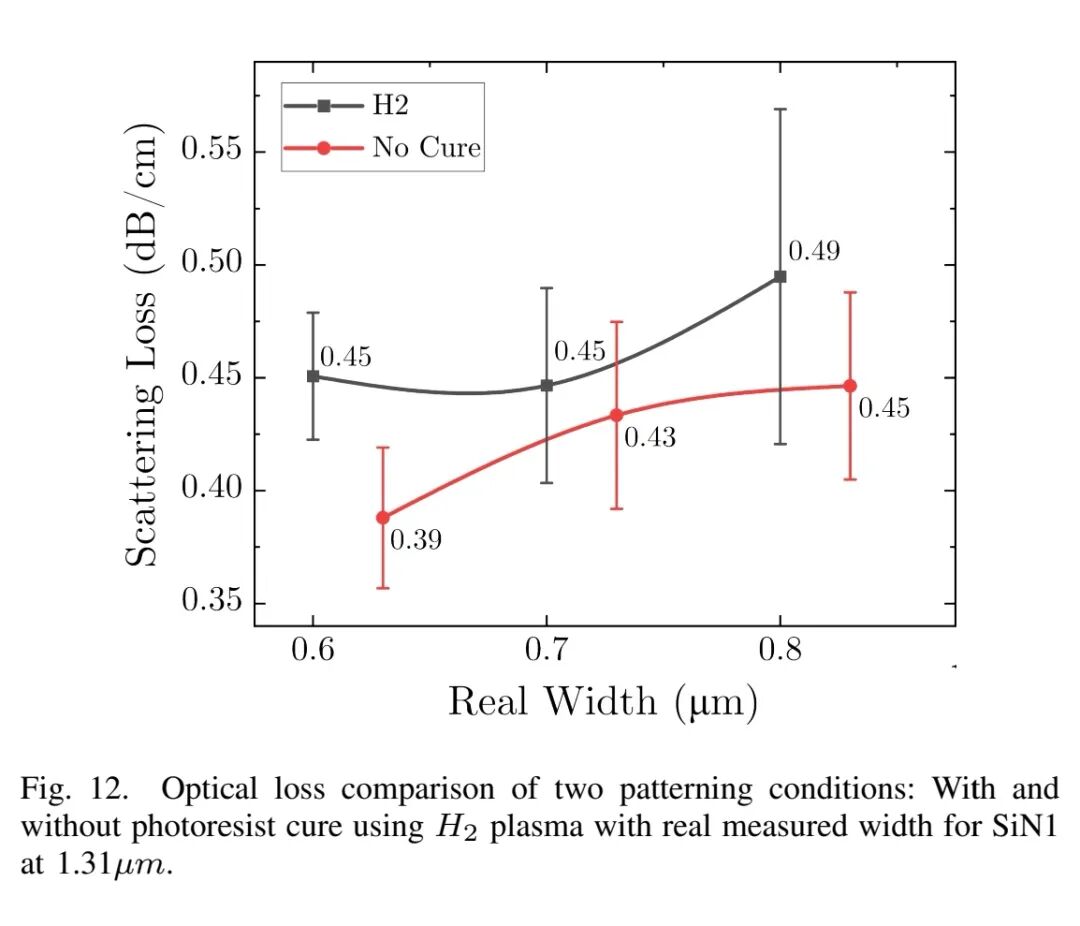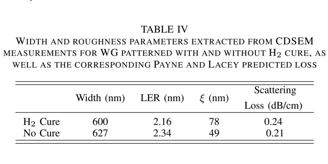 波导侧壁粗糙度的根源是光刻胶图形的粗糙度,H₂退火处理是降低光刻胶侧壁粗糙度的有效手段,但会导致相关长度增加。实验对比了SiN1波导有无H₂退火处理的损耗差异:无H₂固化时,LER略增至2.34 nm,但相关长度降至49 nm,波导宽度增加27 nm;根据模型预测,无H₂退火的波导损耗应比有H₂固化低12%,这与实验结果完全吻合(全宽度范围内,无H₂退火样品损耗普遍低0.04-0.1 dB/cm)。该结果表明,在低粗糙度振幅的基础上,控制相关长度对降低散射损耗至关重要,如何在不增加粗糙度的前提下抑制相关长度增长,是工艺优化的关键方向。