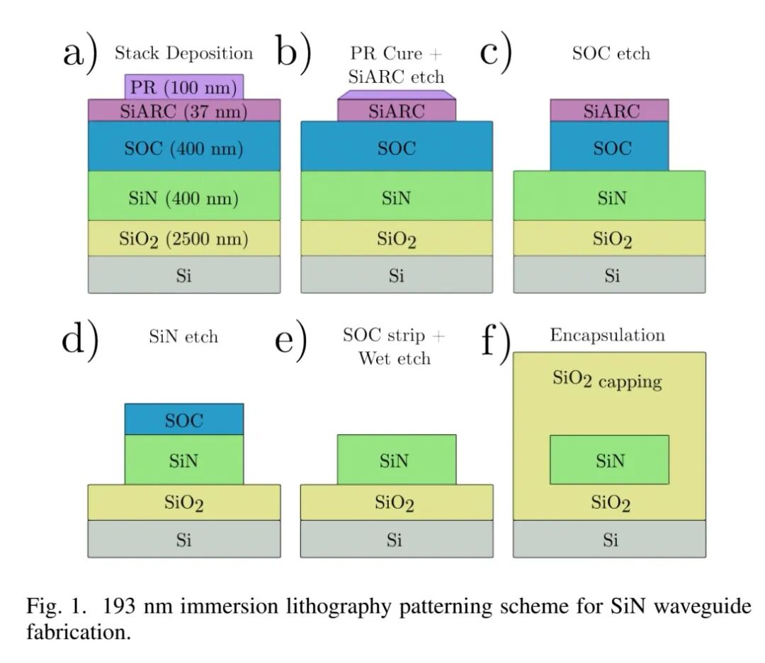 实验基于300 mm Si晶圆开展大规模兼容制备,基底为2.5 μm热氧化层(SiO₂),其上通过AMAT Producer GT系统在400°C下沉积400 nm厚PECVD SiN层(Si₃N₄)。波导图形化采用193 nm浸没式光刻技术,搭配三层掩模结构(100 nm光刻胶+37 nm Si抗反射涂层+400 nm旋涂碳层),以解决193 nm光刻胶刻蚀选择性有限的问题。光刻设计包含700-1100 nm宽条形波导,以及适配1.31 μm和1.55 μm单模传输的光栅耦合器。