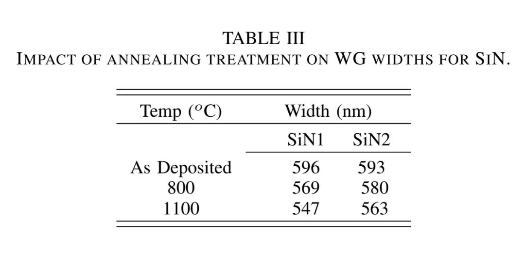 退火的积极效果同样显著:SiN2在1.31 μm波段的损耗降至0.18-0.24 dB/cm,与模型预测的散射损耗完全匹配,实现了仅由散射主导的超低损耗;1.55 μm波段损耗降至0.35-0.38 dB/cm,虽因N悬空键仍高于模型预测,但已显著低于未退火样品(3.85 dB/cm),且优于LPCVD SiN的0.72 dB/cm。值得注意的是,退火温度超过400°C会丧失BEOL兼容性,因此仅适用于无热预算约束的场景。