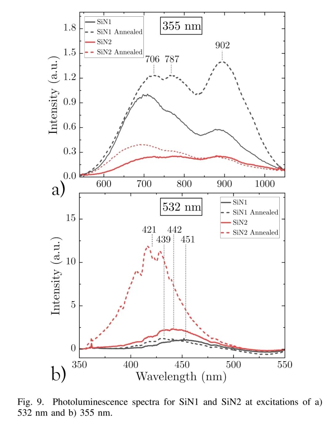 但退火会引入新的缺陷,且缺陷类型与SiN初始成分相关:Si-rich的SiN1会形成大量大尺寸Si-Si纳米团簇,导致1.31 μm波段损耗增至约1.6 dB/cm(是未退火样品的4倍);N-rich的SiN2则生成N悬空键,对1.31 μm波段损耗影响较小,但会增加1.55 μm波段的吸收。