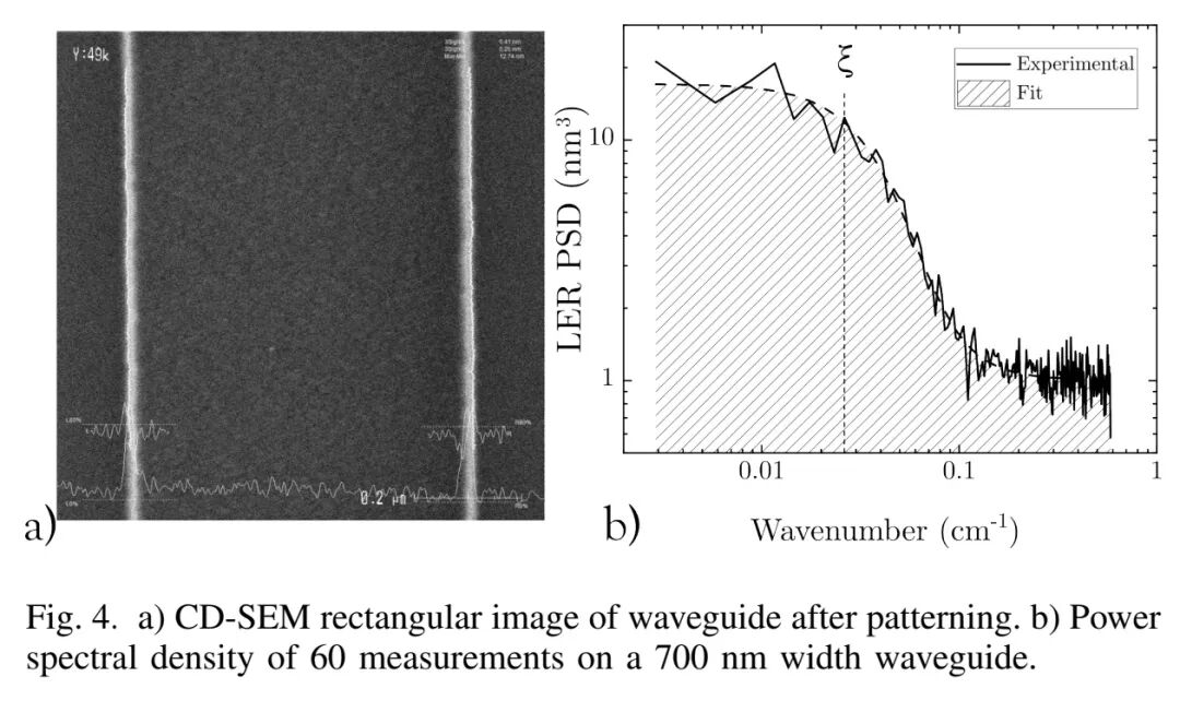 波导关键尺寸与粗糙度通过临界尺寸扫描电子显微镜(CD-SEM)表征,采用功率谱密度(PSD)拟合方法提取无偏线边缘粗糙度(LER)与相关长度ξ:光刻后光刻胶的LER为3.3±0.1 nm、ξ=27 nm,SiN刻蚀后波导的LER优化至2.1±0.1 nm、ξ=78 nm,波导实际宽度为600±3 nm(较标称值缩减100 nm,部分源于H₂固化等离子体处理)。