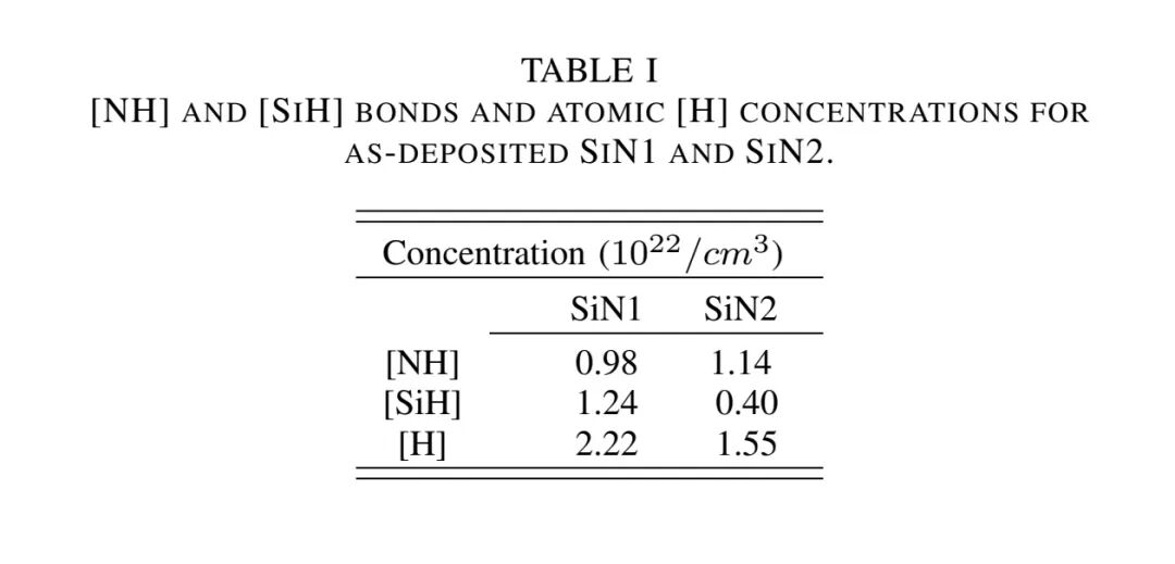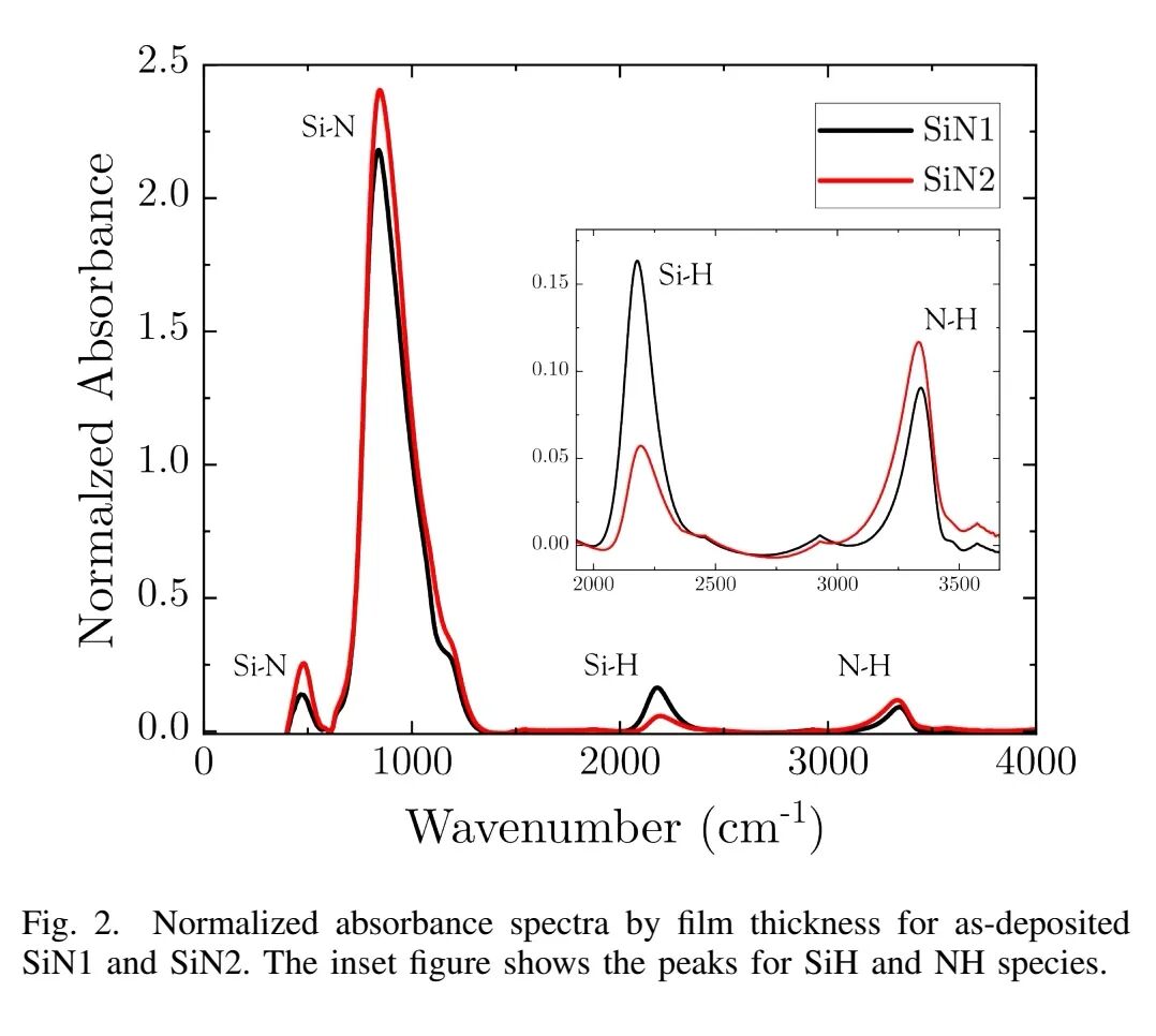 傅里叶变换红外光谱(FTIR)表征显示,两种材料均存在Si-N(470 cm⁻¹、830 cm⁻¹)、Si-H(2180 cm⁻¹)和N-H(3350 cm⁻¹)特征吸收峰,通过积分计算得SiN1的总氢浓度(2.22×10²²/cm³)高于SiN2(1.55×10²²/cm³),其中SiN1的Si-H浓度(1.24×10²²/cm³)是SiN2(0.40×10²²/cm³)的3倍。