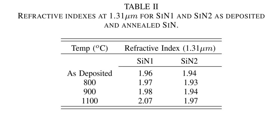 研究选用两种PECVD SiN材料(SiN1、SiN2),SiN1采用SiH₄/N₂前驱体并经400°C H₂处理,SiN2采用SiH₄/N₂/NH₃前驱体且无H₂处理。通过椭圆偏振仪测得1.31 μm波长下SiN1和SiN2的折射率分别为1.956和1.940,1.55 μm波长下略低(约0.1%)。