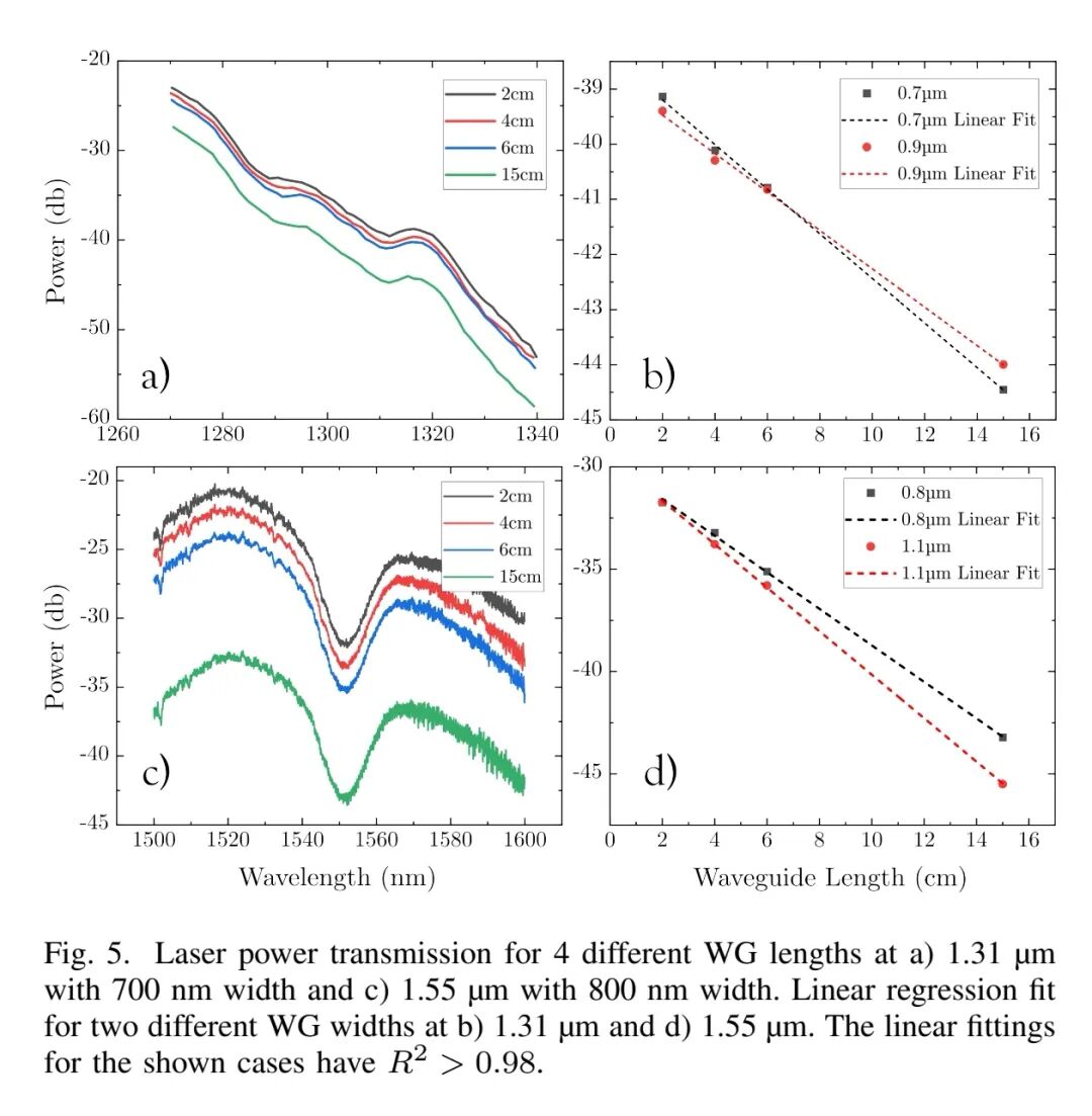 光学损耗测试采用半自动12英寸探针台,搭配可调谐激光器(皮米级分辨率)与光电探测器,通过1D TE偏振光栅耦合器(1.31 μm对应周期0.96 μm,1.55 μm对应周期1.15 μm)实现光纤与波导耦合。测试覆盖1270-1340 nm(O波段)与1500-1600 nm(C波段),通过测量0.9-15 cm不同长度波导的透射功率,经线性回归拟合(R²>0.98)提取损耗系数(dB/cm),结果为15个芯片的平均值。
