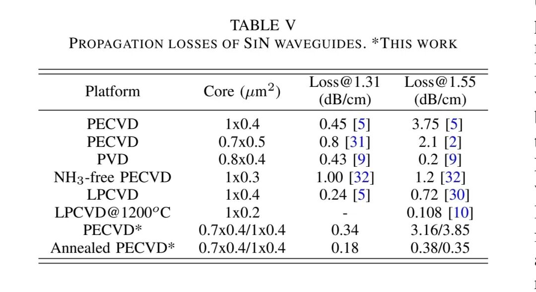 未退火的PECVD SiN波导在1.31 μm波段实现0.34 dB/cm的损耗,优于标准PECVD、物理气相沉积(PVD)及无氨PECVD SiN,仅略高于非BEOL兼容的LPCVD SiN(0.24 dB/cm);退火后的PECVD SiN2在1.31 μm波段损耗(0.18 dB/cm)超越LPCVD SiN,1.55 μm波段损耗(0.35 dB/cm)低于LPCVD SiN,但仍不及BEOL兼容的PVD SiN(0.2 dB/cm)。而PVD SiN在1.31 μm波段的损耗(0.43 dB/cm)高于本研究的PECVD SiN,表明PECVD结合优化光刻工艺在O波段具有独特优势。