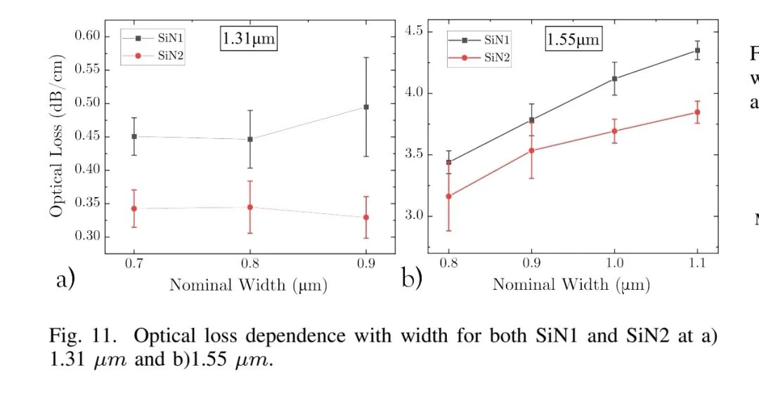 在1.55 μm波长(C波段),氢相关键的吸收损耗成为主导。SiN1和SiN2的损耗均达到3 dB/cm以上,是1.31 μm波段的10倍、模型预测散射损耗的17倍。这是因为N-H键的一级倍频峰靠近1500 nm,Si-H键的二级倍频峰延伸至C波段,两者共同加剧吸收损耗;且损耗随波导宽度增加而上升——宽波导使光模式更集中于芯层,与缺陷的重叠度提高,吸收损耗进一步放大。