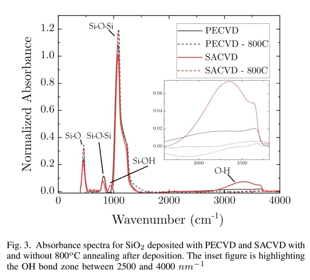 包层方面,对比了亚大气压化学气相沉积(SACVD)与PECVD制备的SiO₂,两者在1.31 μm波长的折射率接近(1.446 vs 1.452),但SACVD SiO₂含大量OH键(3400 cm⁻¹吸收峰),经800°C N₂退火后OH键可完全消除。