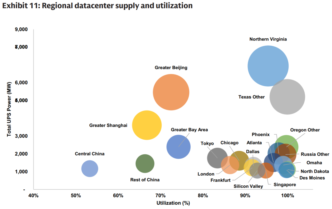 全球各区域数据中心电力容量与利用率气泡图,注意:北弗吉尼亚(右上角)与其他区域的巨大体量与利用率差异。