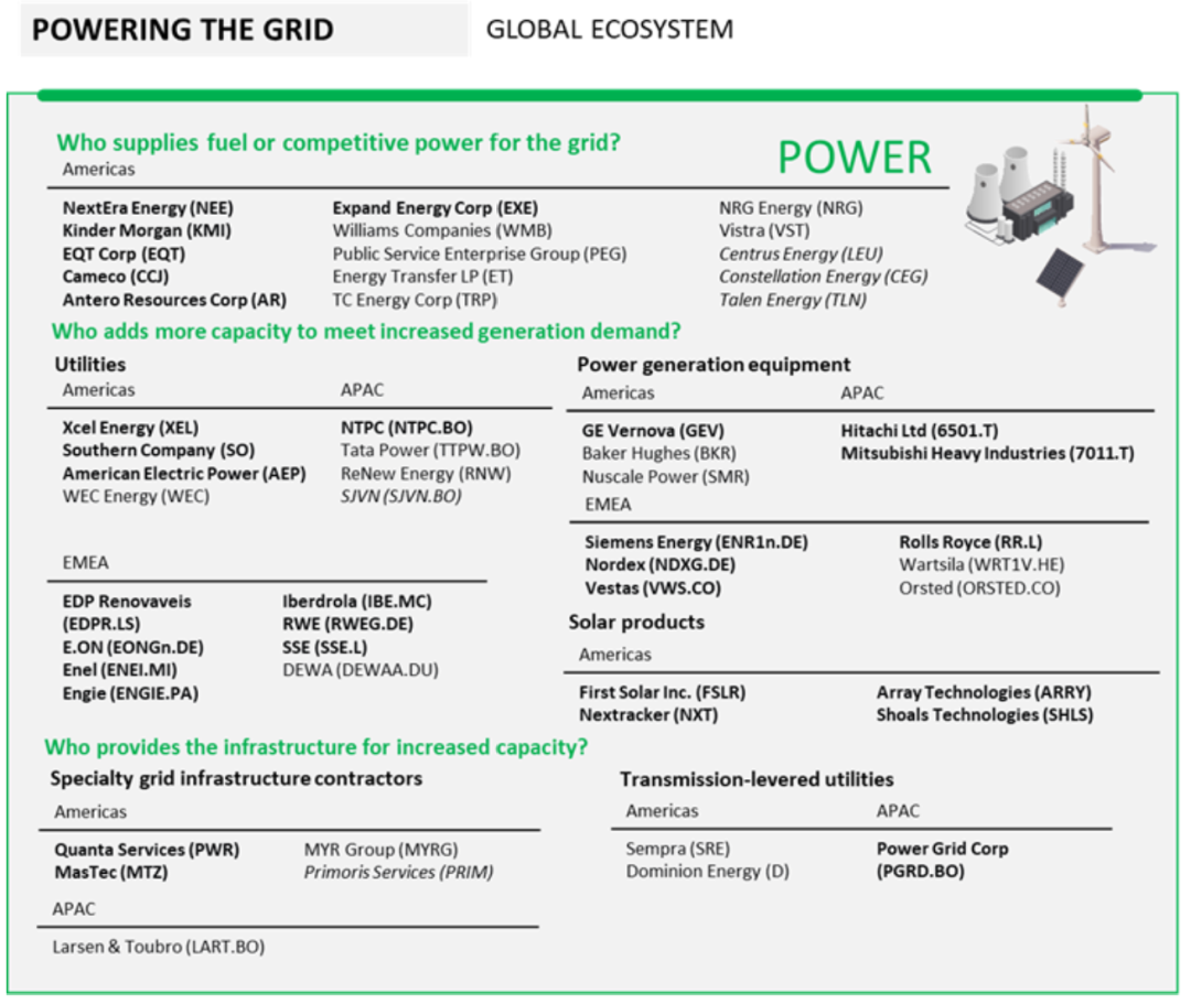 高盛提出了 "6 Ps" 框架(Pricing, Policy, Parts, People, Pervasiveness, Productivity)来分析电力瓶颈。结论令人警醒:短期内,零部件(Parts)和人力(People)的短缺比价格(Pricing)和政策(Policy)更致命。