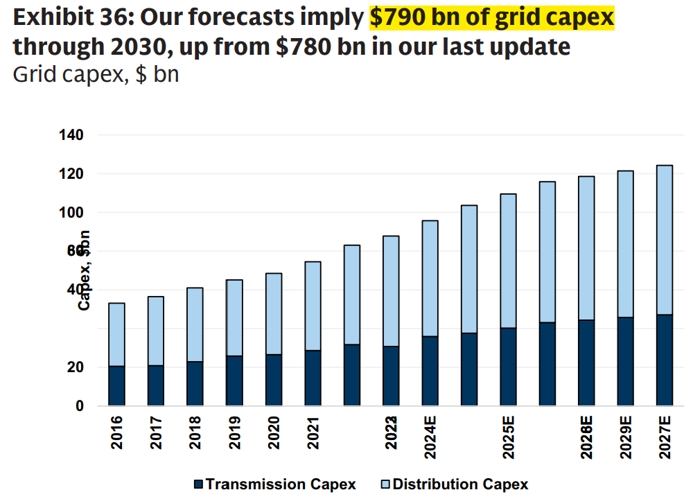 基于最新的EEI预测,高盛将美国2030年前的电网资本支出预测从7800亿美元上调至7900亿美元。这其中,配电网(Distribution)仍是主要支出方向,但输电网(Transmission)的增速正在加快。