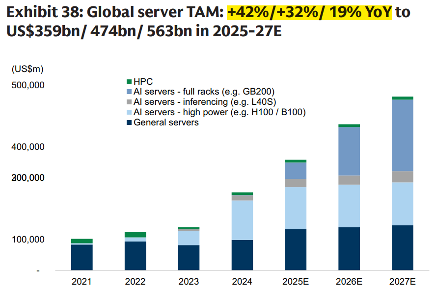 TAM大爆发: 2027年全球服务器TAM将达到5630亿美元,其中AI服务器占据绝对主导。