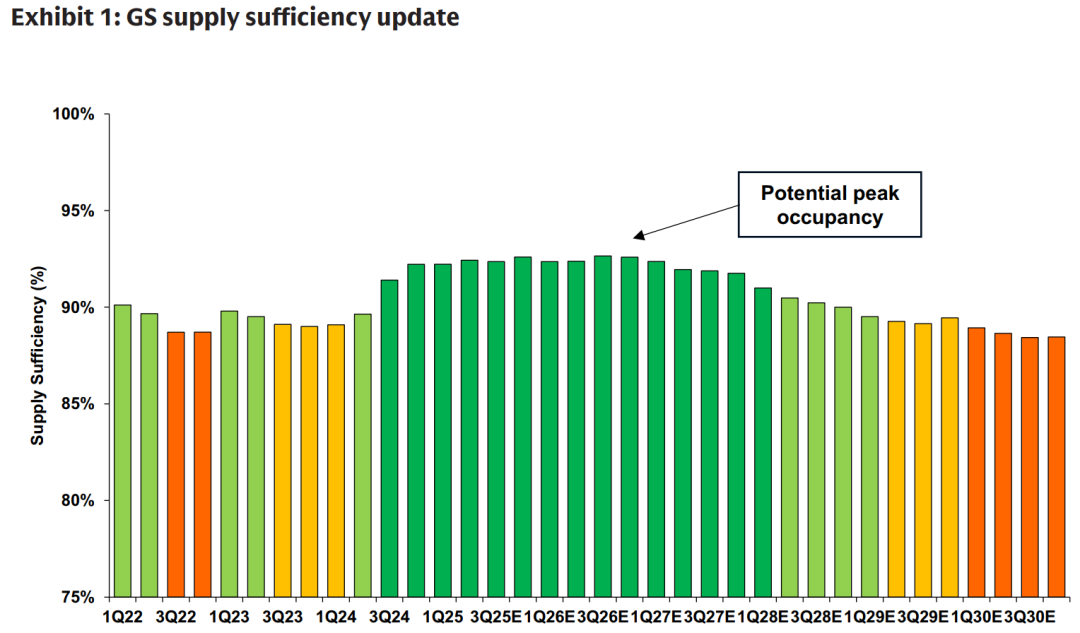 高盛全球数据中心供应充足率预测(2022-2030E),该图展示了供应紧张(低充足率)将如何延伸至2026年,并在之后缓慢缓解。