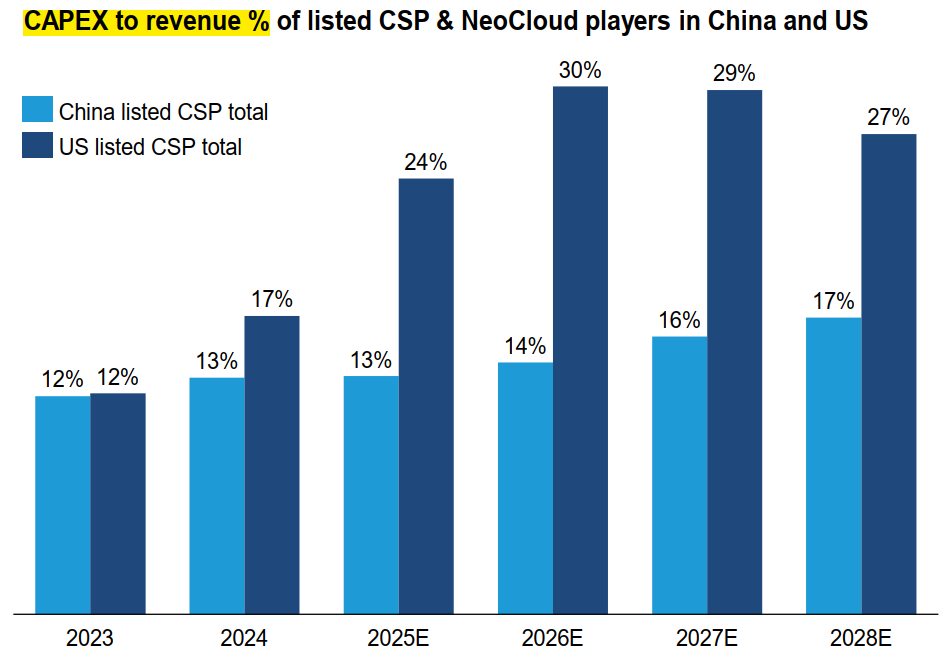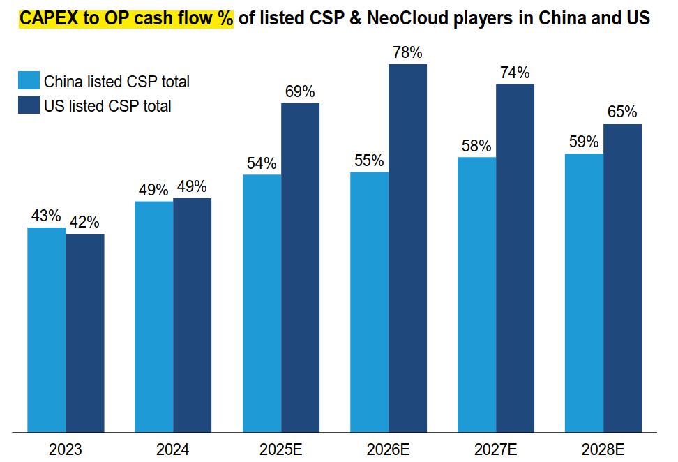 对比美国同行(深蓝色柱子),中国厂商(浅蓝色柱子)的Capex占经营现金流的比例只有40-60%,占收入比例仅~17% 。这意味着:只要卡不够,他们还有大把的钱可以砸进去。