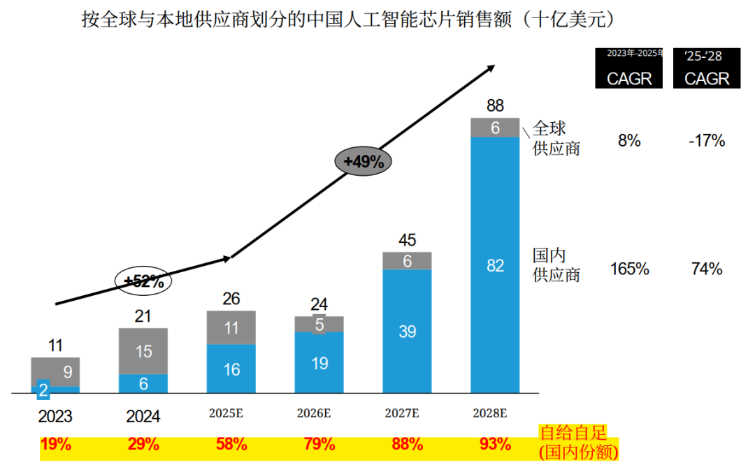 这就创造了一个巨大的TAM:到2028年,中国市场将产生880亿美元的AI芯片需求。