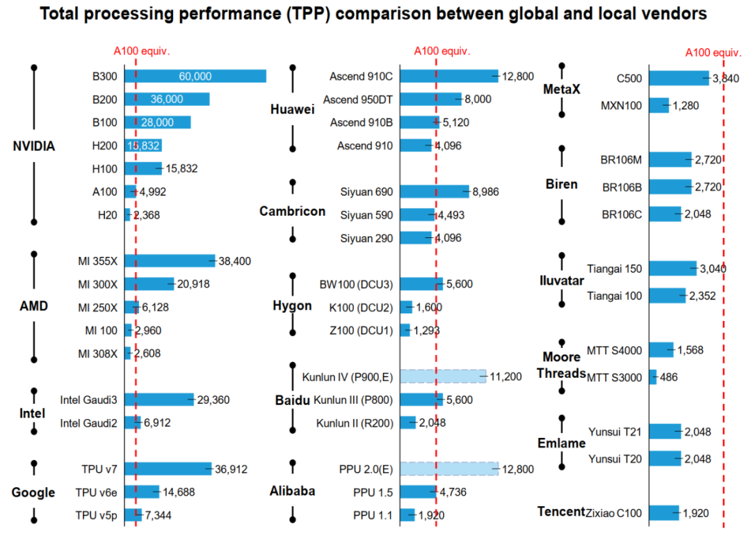 虽然我们一直在说国产替代,但技术差距是要正视的。 Bernstein用TPP作为指标(虽然不是完美的apple-to-apple),对比了国内外主力芯片。