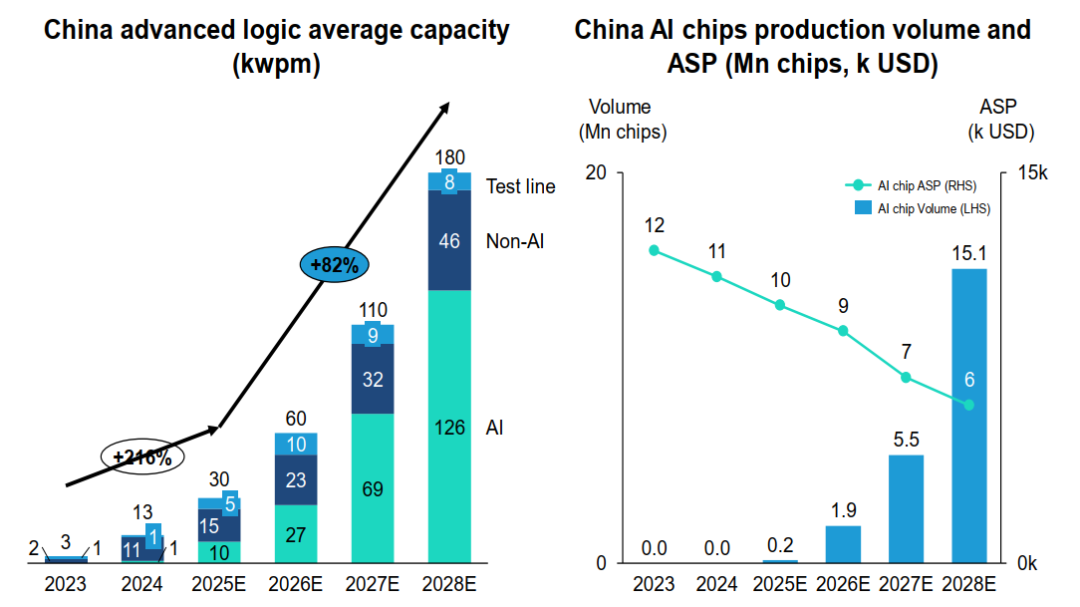 看下面这张图,AI芯片产量在2026年和2027年呈现了指数级的跳升。Bernstein预计,本土先进产能将在未来三年增长10倍以上,从2025年的平均10k wpm(千片晶圆/月)增长到2028年的126k。
