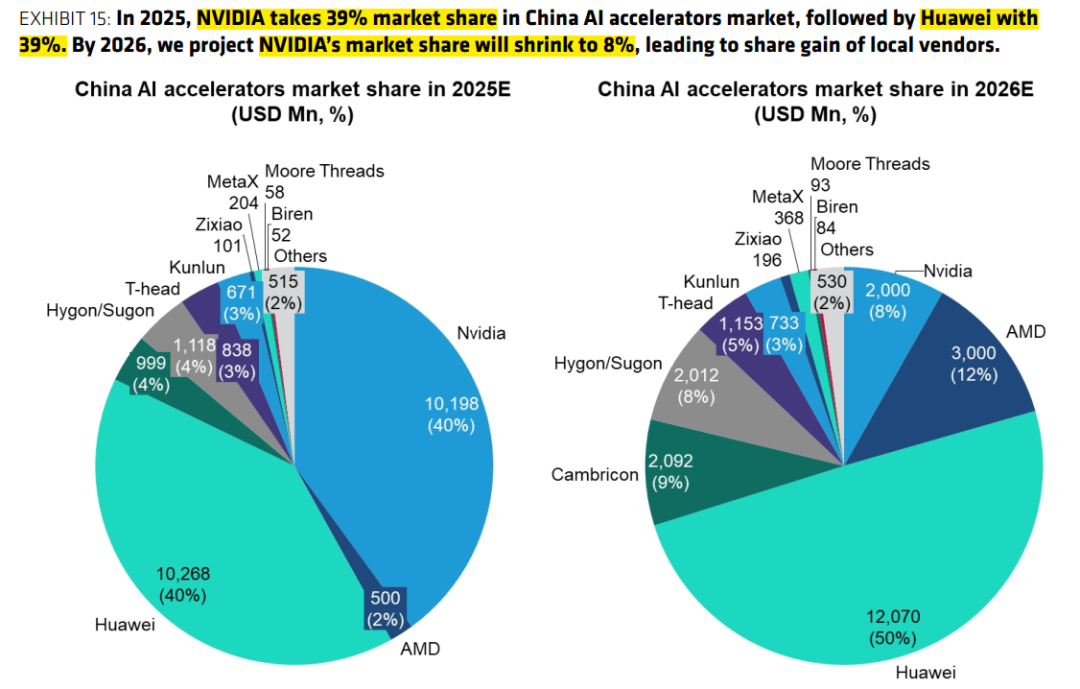 2025年,英伟达在中国人工智能加速器市场占据39%的市场份额,其次是华为,占39%。到2026年,我们预计英伟达的市场份额将降至8%,本土供应商的份额将增加。