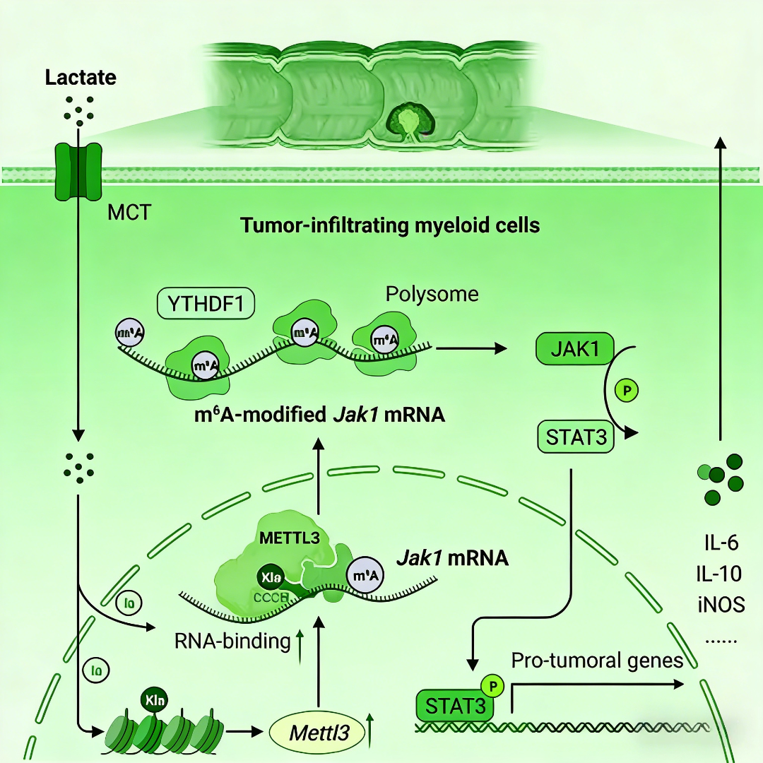 METTL3表达上调后,其催化产生的m6A RNA修饰在肿瘤浸润髓系细胞中全局性增加。通过高通量测序结合功能验证,研究发现Jak1 mRNA是METTL3的关键下游靶标。METTL3介导的m6A修饰特异地发生在Jak1 mRNA的特定区域,该修饰被m6A阅读蛋白YTHDF1识别。YTHDF1通过促进m6A修饰mRNA的翻译效率,显著增强了JAK1蛋白的合成。JAK1是Janus激酶家族成员,其蛋白水平的升高导致下游信号转导与转录激活因子STAT3的磷酸化被持续激活。STAT3通路是众所周知的免疫抑制信号枢纽,其激活可驱动一系列免疫抑制相关基因的表达,从而巩固和增强肿瘤浸润髓系细胞的免疫抑制表型与功能。由此,乳酸化修饰通过上调METTL3,建立了一条从表观遗传到转录后调控的级联通路,最终放大了细胞内的免疫抑制信号。
