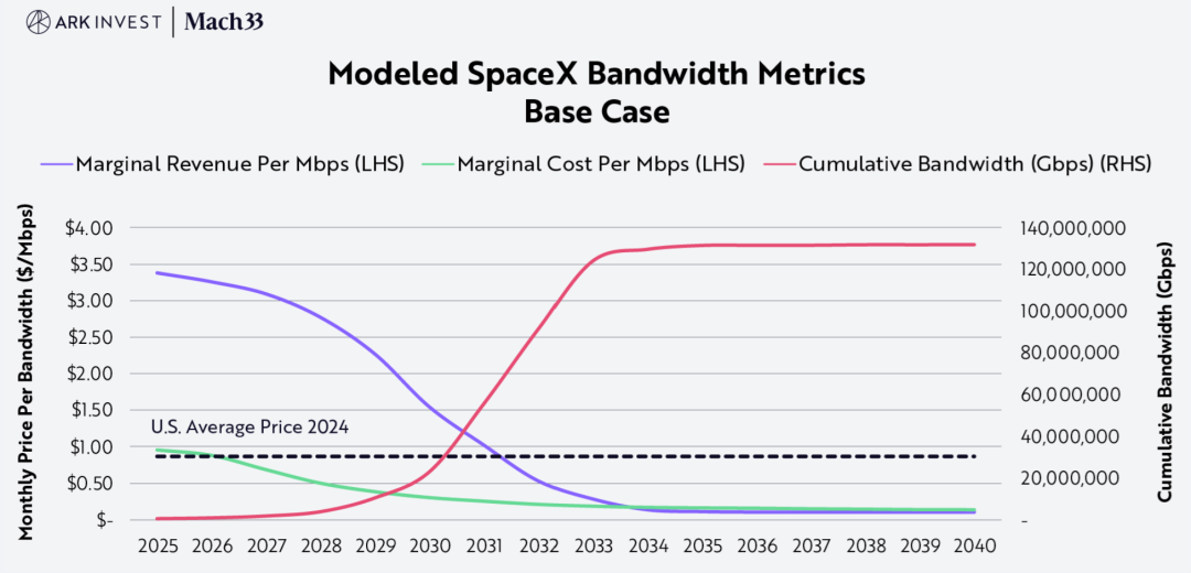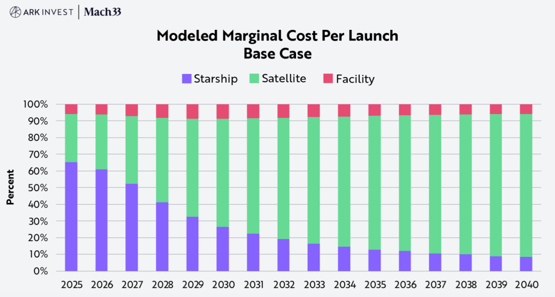 这个数字如何得出?ARK的研究表明,全球宽带通信支出约为2万亿美元。Starlink的潜在市场占其中约15%。同时,随着 Starship 重复使用率提升,模型里可以看到卫星在总边际成本中的占比从约 30% 拉升到接近 90%。这意味着火箭更像“Capex 平台”,而网络经济性越来越由卫星性能决定。