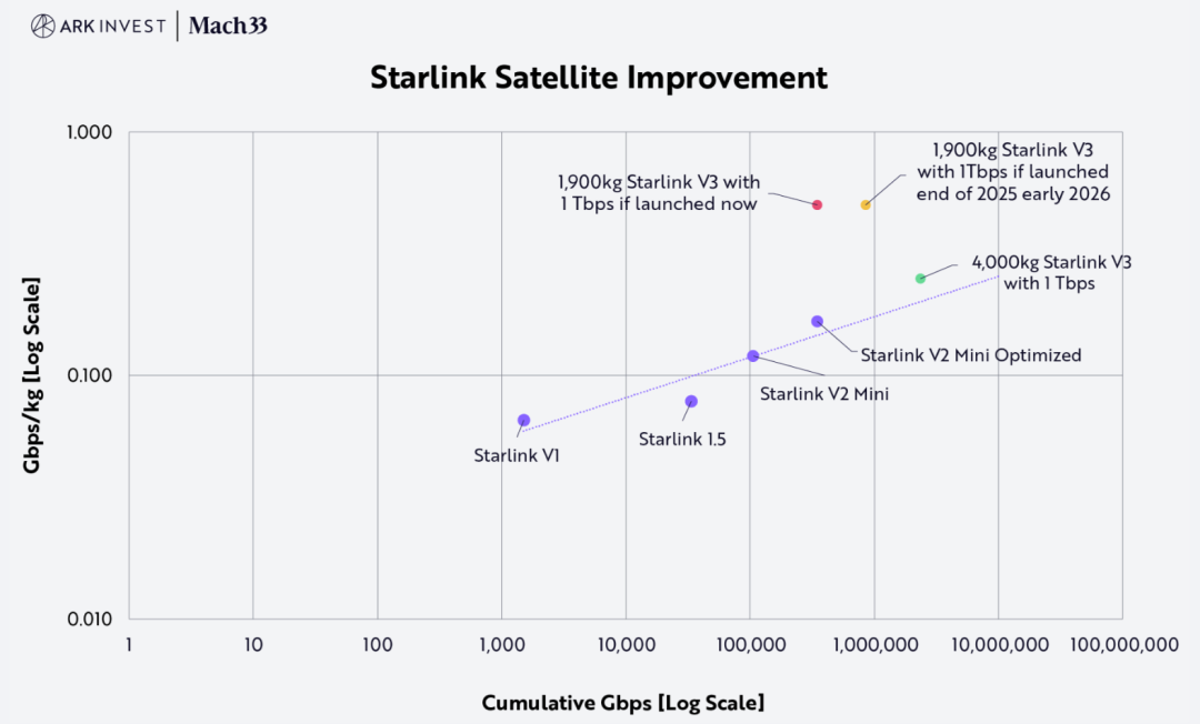 如果对比从 V1 到 V2 Mini 的实际数据,再把 ARK 假设的 1Tbps 卫星标上去,可以直观看到它们大致都落在同一条 Wright 定律学习曲线附近。