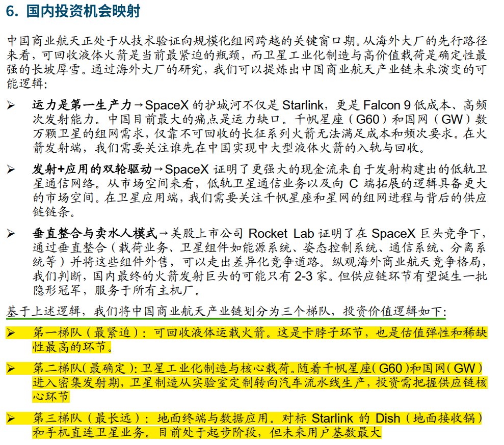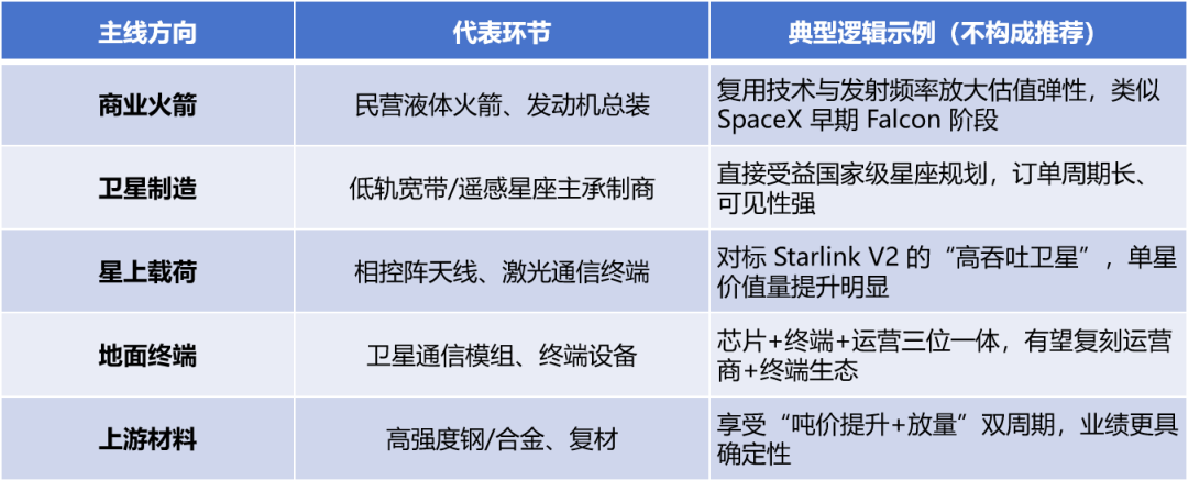 很现实的一点是:短期内我们直接买不到 SpaceX 的股权,大多数人能接触到的,只有二级市场和少量美元基金份额。所以如果站在 A 股 / 港股的维度,机会大概集中在三条主线: