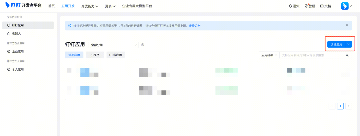 前往钉钉开发者平台(需有管理员权限):https://open-dev.dingtalk.com/fe/app?hash=%23%2Fcorp%2Fapp#/corp/app
