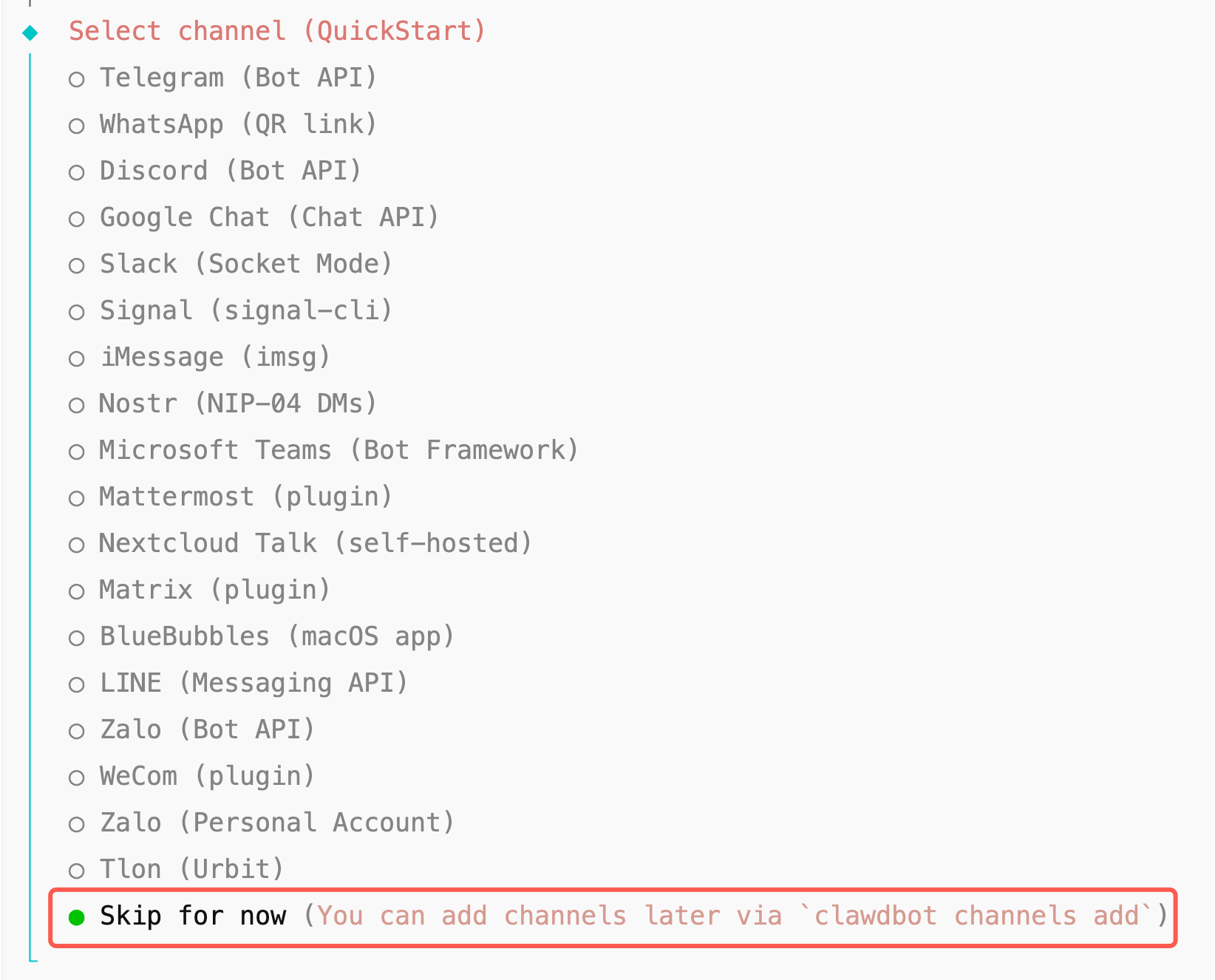 频道选择这里可以先跳过,我们后面使用命令配置钉钉通道