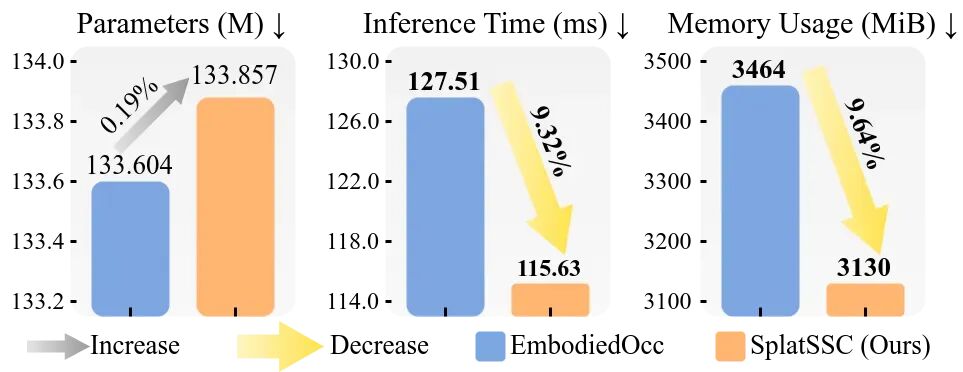 图 6:效率指标对比。实验结果表明,通过引入几何引导的稀疏表征,SplatSSC 仅付出极小的参数成本,即可显著降低推理延迟与显存占用。
