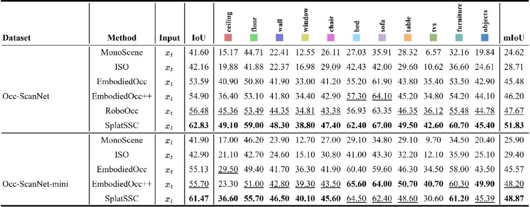 表 1:Occ-ScanNet 数据集上的局部预测性能对比。实验结果显示,SplatSSC 在 IoU 与 mIoU 各项指标上均刷新了记录。表中加粗部分代表最优结果,下划线代表次优结果。