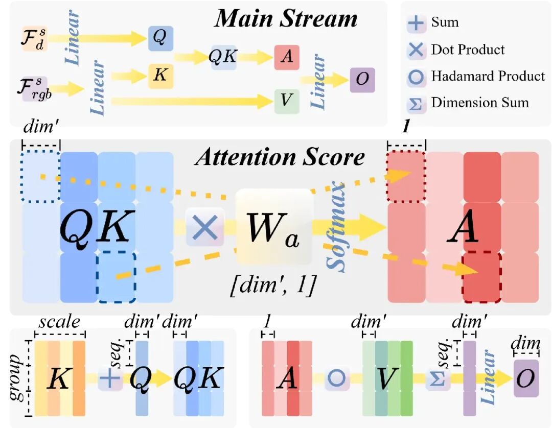 权重矩阵在不同的特征组和尺度间实现了参数共享。这一设计在显著减少显存消耗的同时,保证了注意力分数计算的高效性。