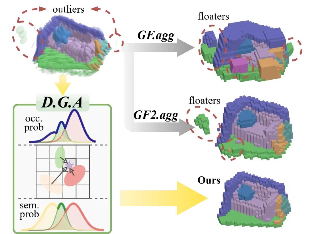 图 4:DGA 鲁棒性演示。传统的聚合方法(如 GF.agg 和 GF2.agg)在面对离群基元时,容易在空旷空间生成错误的 “漂浮物”。DGA 通过解耦占据概率与语义贡献,利用极低的占据概率直接抑制离群点的错误语义映射,从而确保了场景边界的纯净。