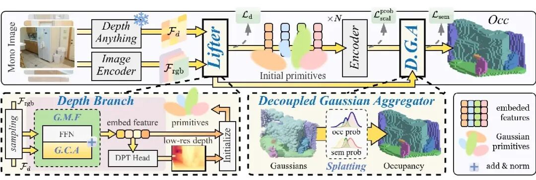 图 2:SplatSSC 架构总览。我们采用并行分支策略:可学习的图像编码器负责多尺度语义提取,而预训练的 Depth-Anything 模型则提供稳定的深度特征。通过组内多尺度融合(GMF)模块,这两类特征在经过采样后被映射到 3D 空间,完成高斯基元的几何初始化,并交由多级编码器进行精炼,最后通过 DGA 模块渲染为语义体素。
