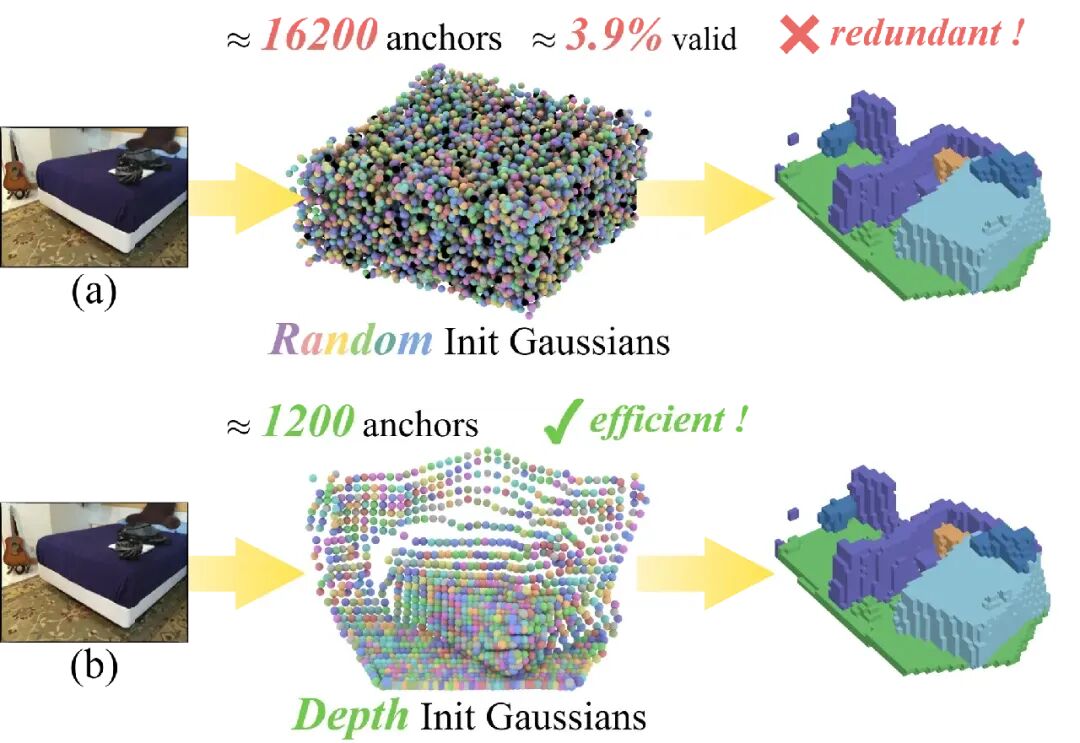 1. 基元初始化的盲目性:现有的方法往往通过在 3D 空间内随机分布数万个高斯基元来覆盖场景。实验发现,这种随机初始化的有效利用率极低(仅约 3.9%),造成了巨大的计算冗余。