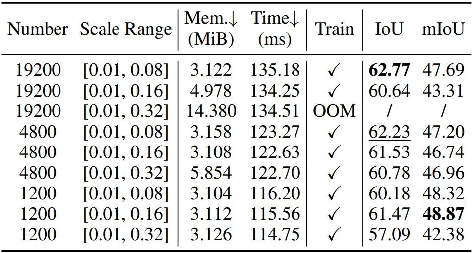 表 2:高斯基元参数消融实验。显存占用与耗时均在单张 RTX 3090 GPU 上测得。