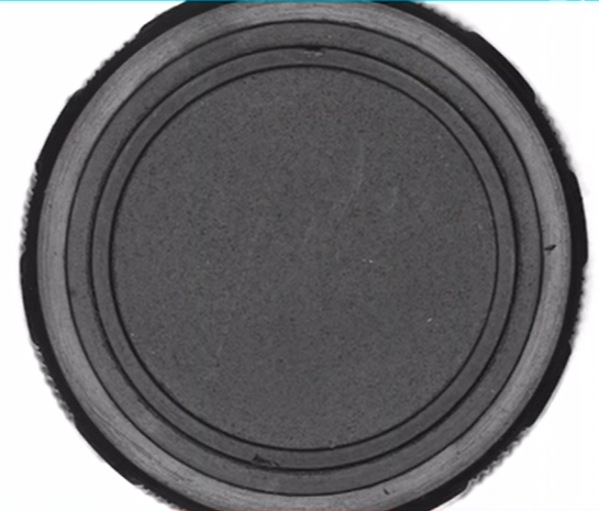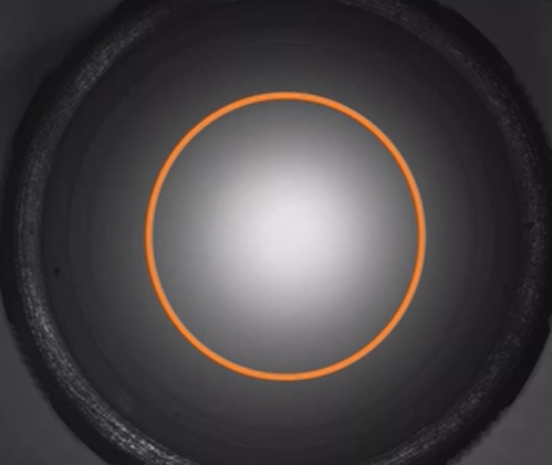 表面粗糙,低反射率的镜头盖远心镜头成像效果如下图所示,当同轴落射照明照射在表面粗糙的工件上时,由于透镜的结构,其反射率很低,同轴落射照明可能会导致图像的中心非常明亮。这个现象称为“热点”,低倍远心镜头更容易受到“热点”现象影响。