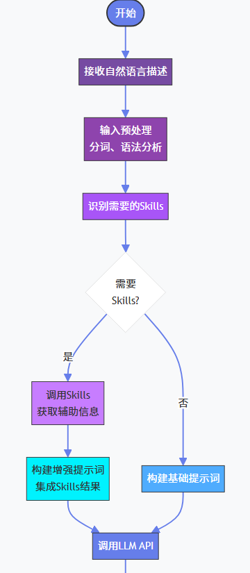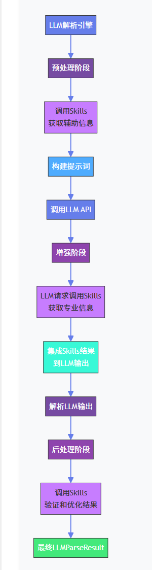 重要技术逻辑修正:Skills 不是 LLM 解析的独立步骤,而是在 LLM 解析过程中被调用的扩展机制。LLM 解析引擎在解析自然语言时,会根据需要调用相应的 Skills 来增强解析能力。