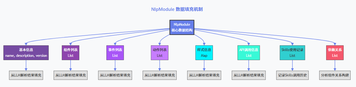 NlpModule 是 ooderA2UI 的核心数据结构,包含了从自然语言描述中提取的所有设计信息。以下是 NlpModule 的工作原理: