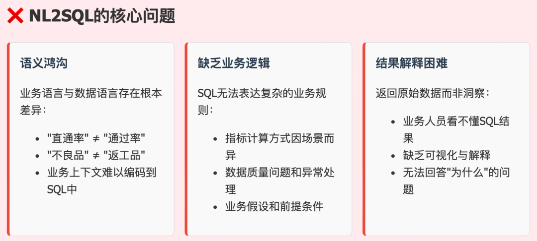 "自然语言转SQL,让业务人员直接问数据"——听起来多么动人。但现实是,当你问"上周A线的良品率为什么下降了"时,系统给你的是一堆看不懂的SQL代码,或者更惨——直接报错。