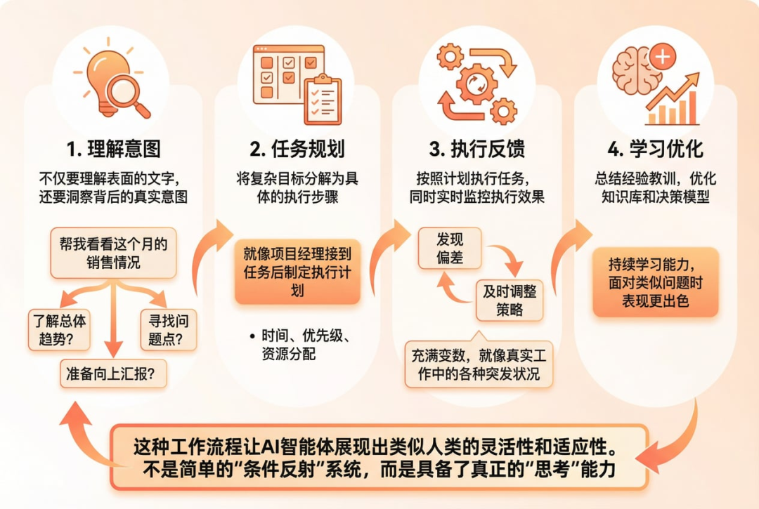 比如当你说"帮我看看这个月的销售情况",智能体需要判断你是要了解总体趋势、寻找问题点,还是准备向上汇报。