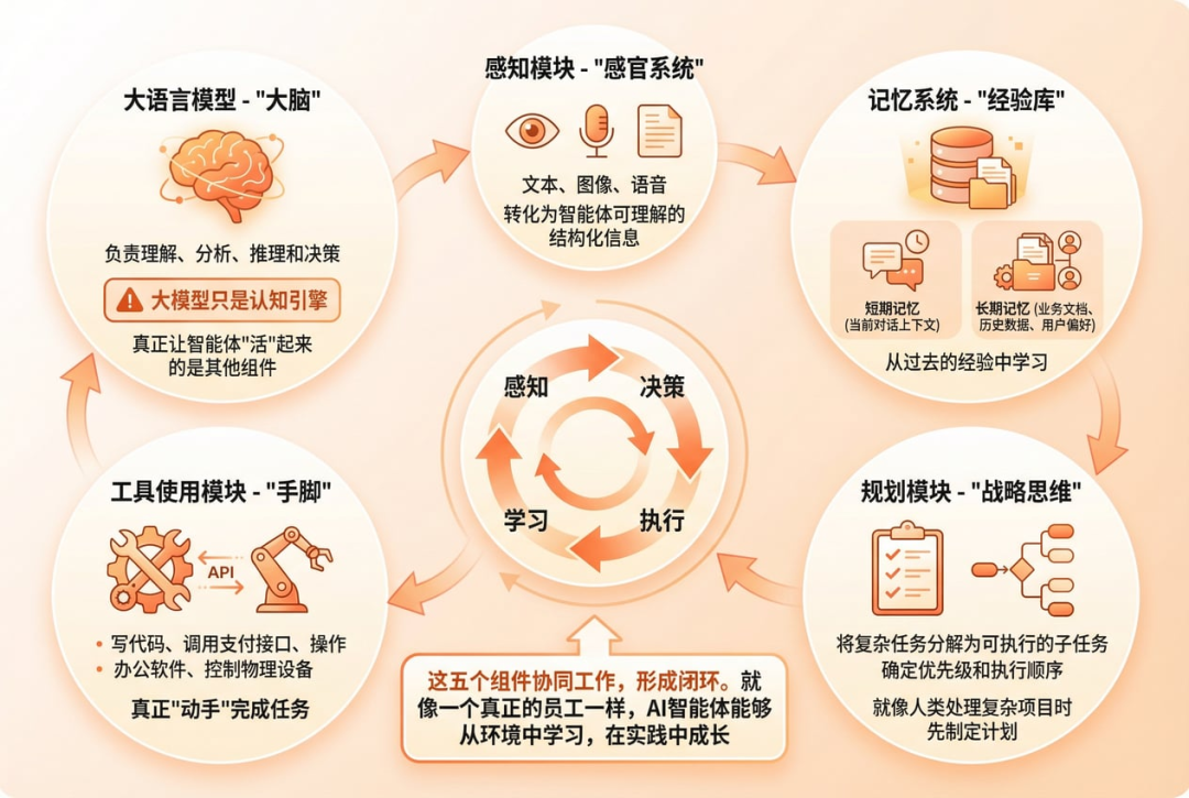 一个完整的AI智能体系统包含五个核心组件,每个都发挥着不可替代的作用。