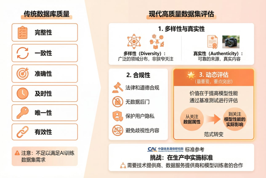 中国信通院组织编制的《高质量数据集 数据质量评估方法》技术标准,为这个新阶段提供了重要的理论支撑和实践指导。
